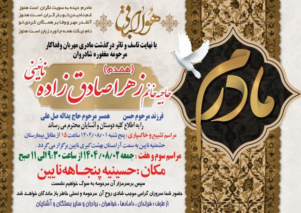در اینجا لازم است از طریق این رسانه از طرف اهالی و هیئت امنای محله پنجاهه نائین این مصیبت را خدمت خانواده های صادق زاده صل علی و دیگر بستگان